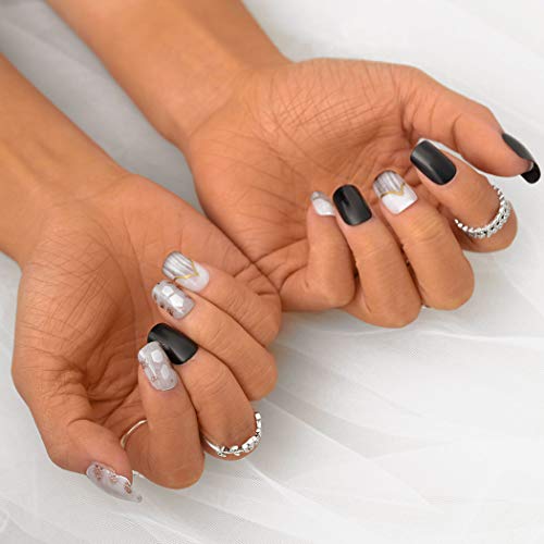 Sethexy Piazza Nero Unghie finte Bling Lucido bianca Unghie finte 24 Pz medio Copertura completa Acrilico Suggerimenti per unghie artistiche Per donne e ragazze