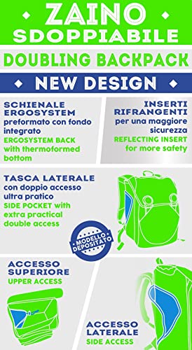 ALTRE CARATTERISTICHE:Zaino con serigrafie fotosensibili che, esposte alla luce solare diretta, cambiano colore! Estensibile con zip. Fibbia bicolore a sgancio rapido. Inserti rifrangenti per protezione a 360°.