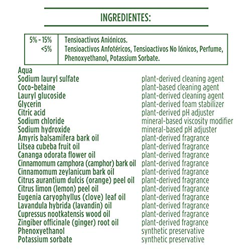 Prodotto per la pulizia realizzato con il 91% di ingredienti di origine vegetale che non contiene profumi sintetici o coloranti.