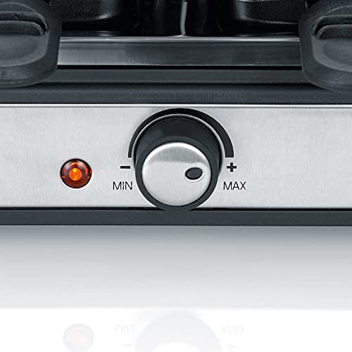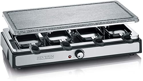 SEVERIN RG 2346 Barbecue per raclette per Feste con Pietra Naturale, Circa 1400 W, 8 padelle antiaderenti, Cavo XXL, 8 raschietti per Legno, Acciaio Inox Spazzolato, Nero