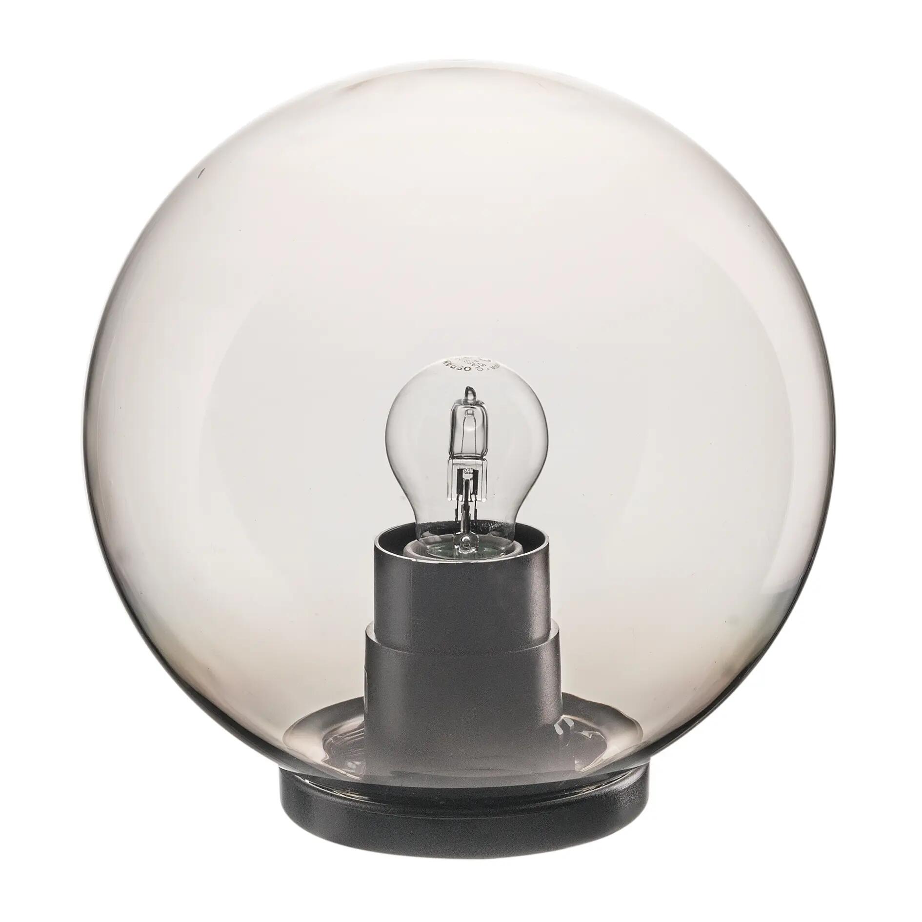Globo per illuminazione esterna, realizzato in metacrilato fumè, completo di base in policarbonato nero. Idoneo per installazione su palo o su braccio a parete dritto o inclinato. Completo di portalampada E27 in ceramica ed accessori di fissaggio. lampadina non inclusa.. IP44: Indicato per luoghi esterni esposti a spruzzi d'acqua provenienti da tutte le direzioni. Ideale per illuminare una zona esterna con luce diffusa