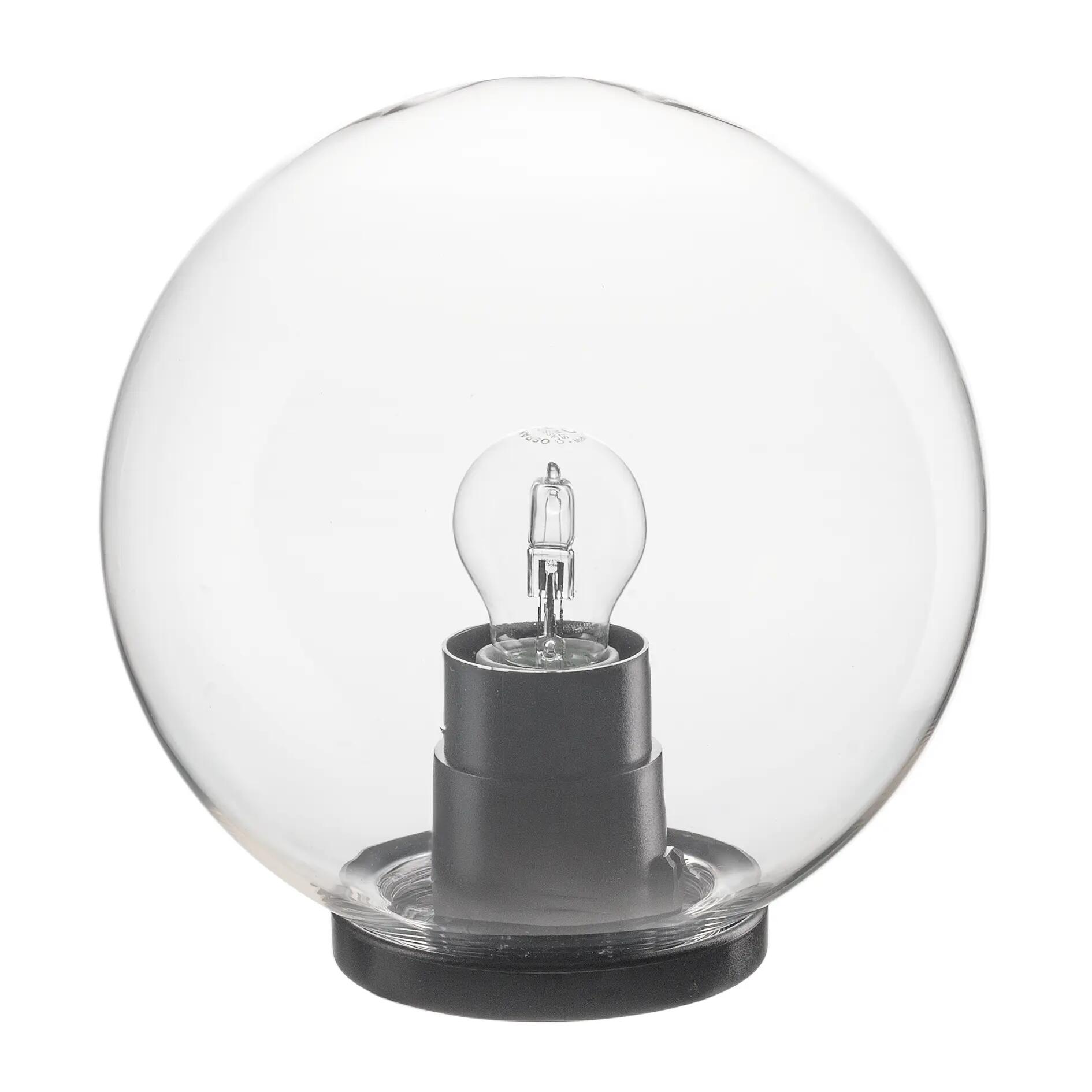 Globo per illuminazione esterna, realizzato in metacrilato trasparente, completo di base in policarbonato nero. Idoneo per installazione su palo o su braccio a parete dritto o inclinato. Completo di portalampada E27 in ceramica ed accessori di fissaggio. lampadina non inclusa.. IP44: Indicato per luoghi esterni esposti a spruzzi d'acqua provenienti da tutte le direzioni. Ideale per illuminare una zona esterna con luce diffusa