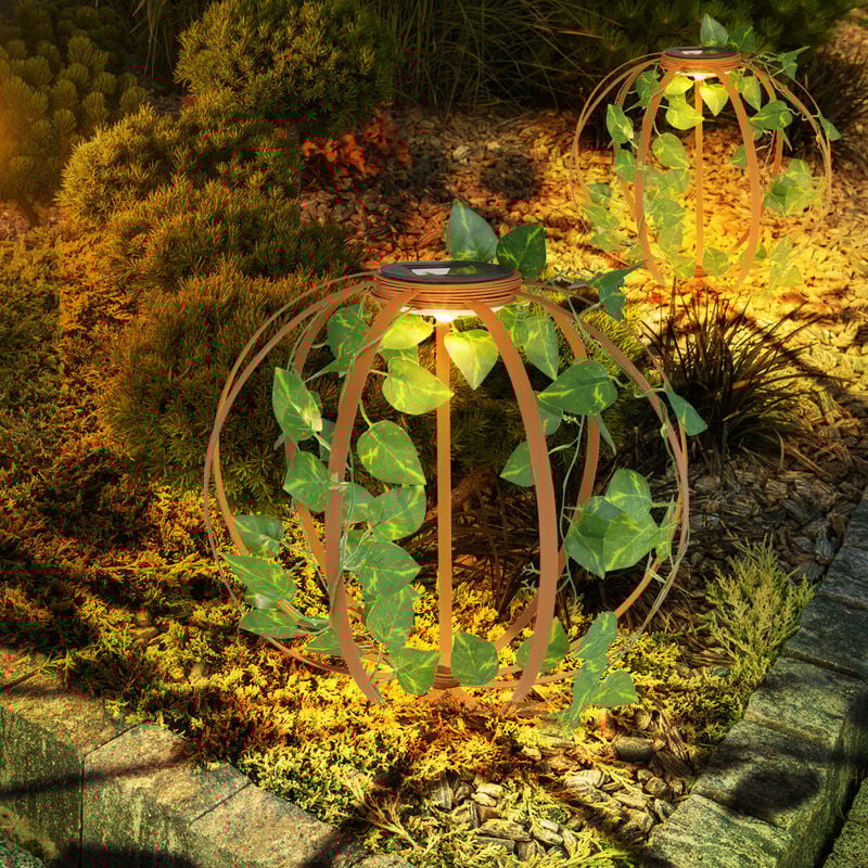 Descrizione Questa lampada solare rotonda con elementi vegetali in plastica (ø27 cm) con classe di protezione IP44 è l'ideale per il tuo giardino. La luce solare color ruggine può essere facilmente posizionata su terreni morbidi, come ad esempio nel prato, grazie alla punta del terreno. La luce bianca calda (3000 Kelvin) della sorgente luminosa a LED a energia solare può contribuire a creare un'atmosfera suggestiva nella tua area esterna. Una sorgente luminosa a LED di alta qualità a risparmio energetico è installata in modo permanente nella lampada. La fornitura comprende due luci solari! Particolare lampada • Tipo di lampada: lampada solare • Materiale: metallo • Colore: ruggine • Elementi vegetali in plastica • Grado di protezione: IP44 • Picchetto a terra • Pacco batteria • Diametro x altezza in cm: 27x38 • Attacco: 1x LED • Lampadina inclusa: sì • Colore della luce: bianco caldo • Temperatura colore: 3000 K • Tensione: 3V