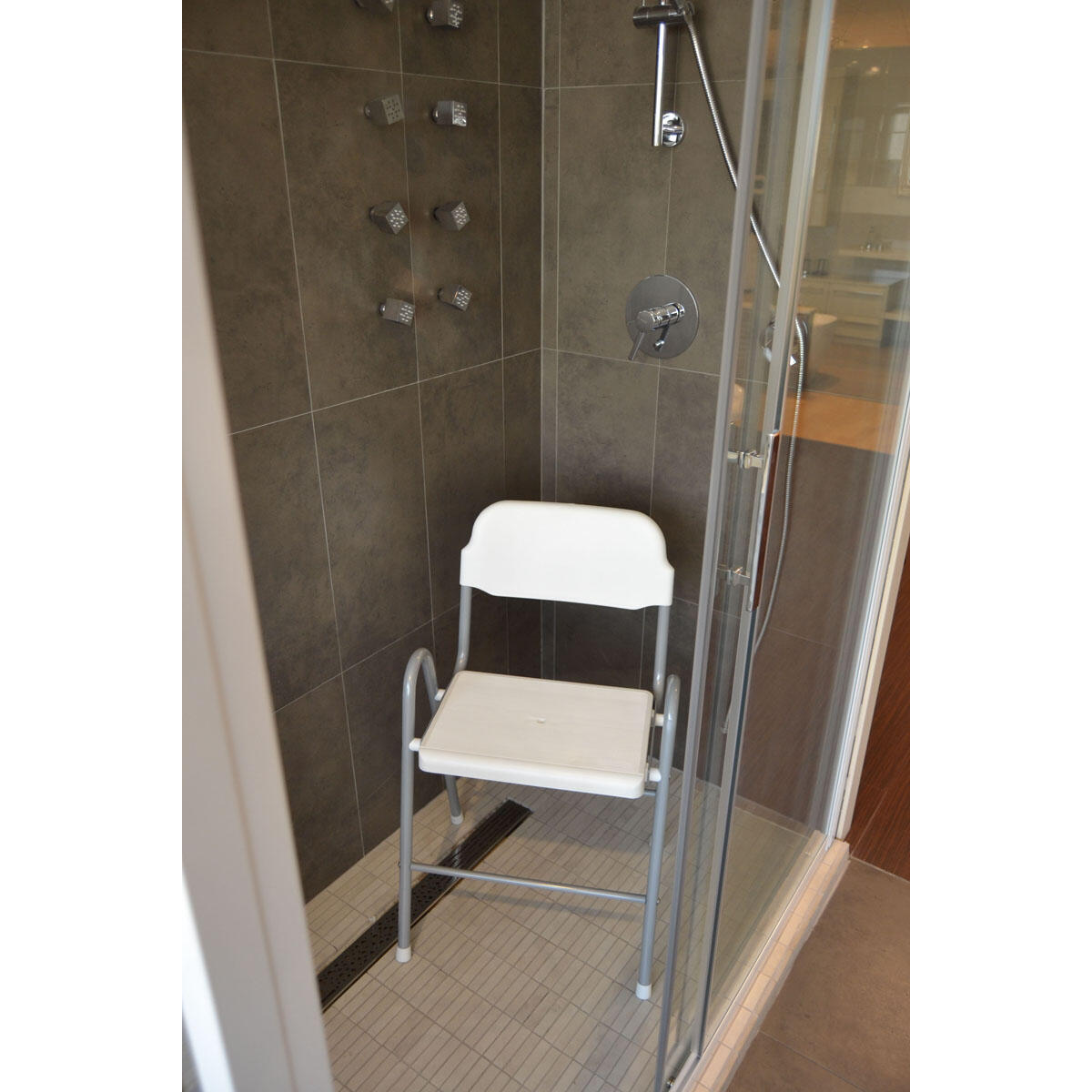 Seduta di sicurezza con schienale, per doccia e bagno, seduta e schienale in polipropilene, telaio acciaio grigio, viti inox, gommini antisdrucciolo, certificato TÜV GS, portata kg. 120. certificazione CE Dispositivo Medicale