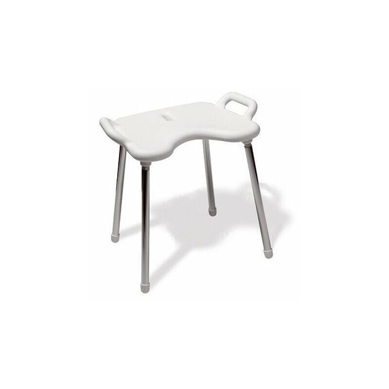 Sgabello solido, di forma ergonomica, con due maniglie integrate, portante fino a 150 kg, peso 9,4 kg, larghezza 533 mm, altezza 531 mm e profondità 400 mm, sedile in PUR, largo 445 mm, profondo 371 mm, con apertura igienica e scarico dell'acqua, quattro gambe in acciaio cromato con pedi resistenti allo scivolamento