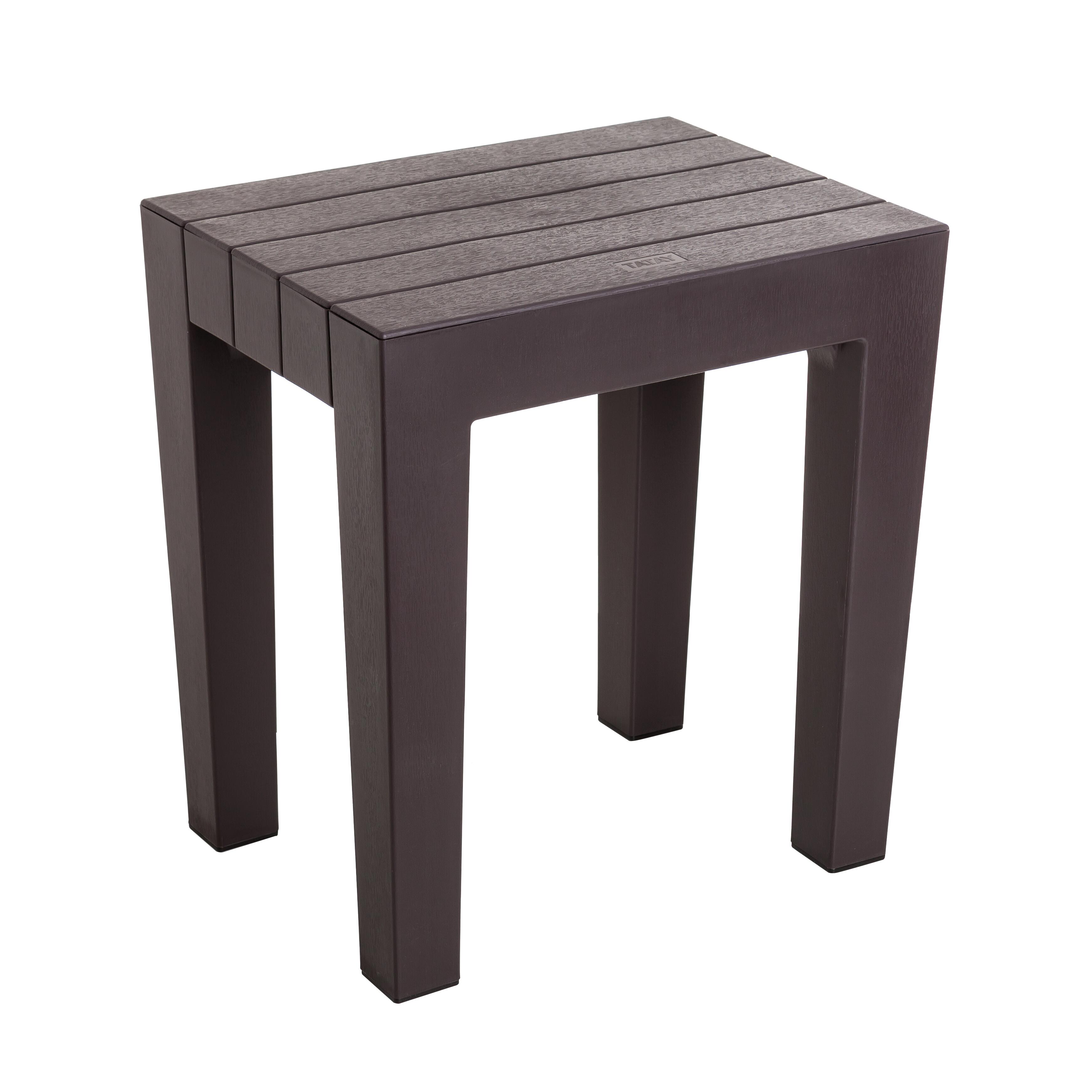 Dimensioni L 38 x H 41 x P 29 cm, portata massima 130 kg.. Adatto per interni ed esterni. Indicato per doccia. Dotato di 4 piedi antiscivolo. Resistente. Design simil legno, materiale anti UVA, rispetta la normativa Une-En 12520 relativa a mobili ad alta resistenza, sicurezza e durata
