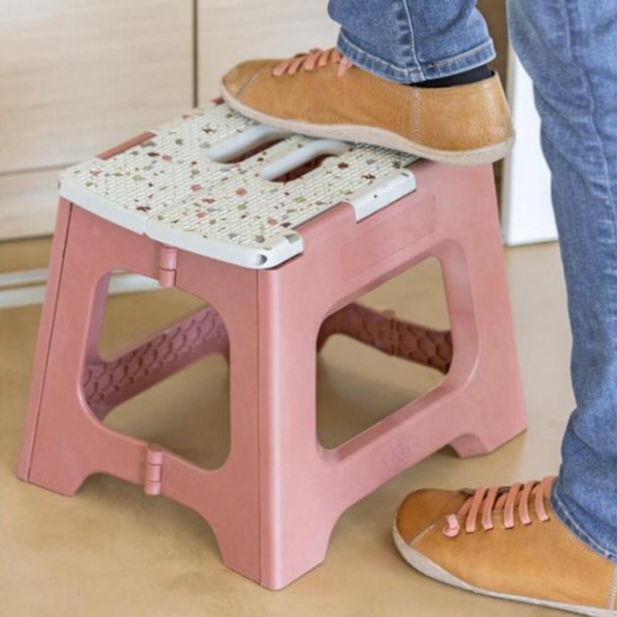 Sgabello pieghevole H 32 cm. Meravigliosamente versatile e di immediato utilizzo, questo sgabello è ideale per raggiungere diverse altezze e facilitare i lavori domestici, ma anche per sedersi. È dotato di un meccanismo di chiusura che consente di ripiegarlo e riaprirlo in un solo gesto. Una volta chiuso, presenta uno spessore di soli 3 cm ed è possibile riporlo dietro alla porta, appenderlo nell'armadio o collocarlo ovunque tu voglia per salvare spazio! Inoltre grazie alla maniglia incorporata, è possibile trasportarlo con enorme facilità. Peso max consentito 150 KG. È dotato di una superficie zigrinata e di piedini in gomma anti-scivolo. Certificato EN-14183. Fabbricato con plastica riciclata. Pluripremiato nei più prestigiosi contests internazionali del design! ATTENZIONE leggere le istruzioni prima dell'uso!