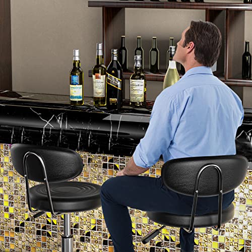Cosa Ricevi: Un set di 2 sgabello girevoli e regolabili in altezza, con schienale e rotelle. Formati da un telaio in acciaio cromato e rivestimento in similpelle, gli sedia girevole scrivania Nero sono antiruggine, resistenti allo strappo, durevoli e in grado di reggere fino a 120kg, massima stabilità anche con rotazione di 360°.