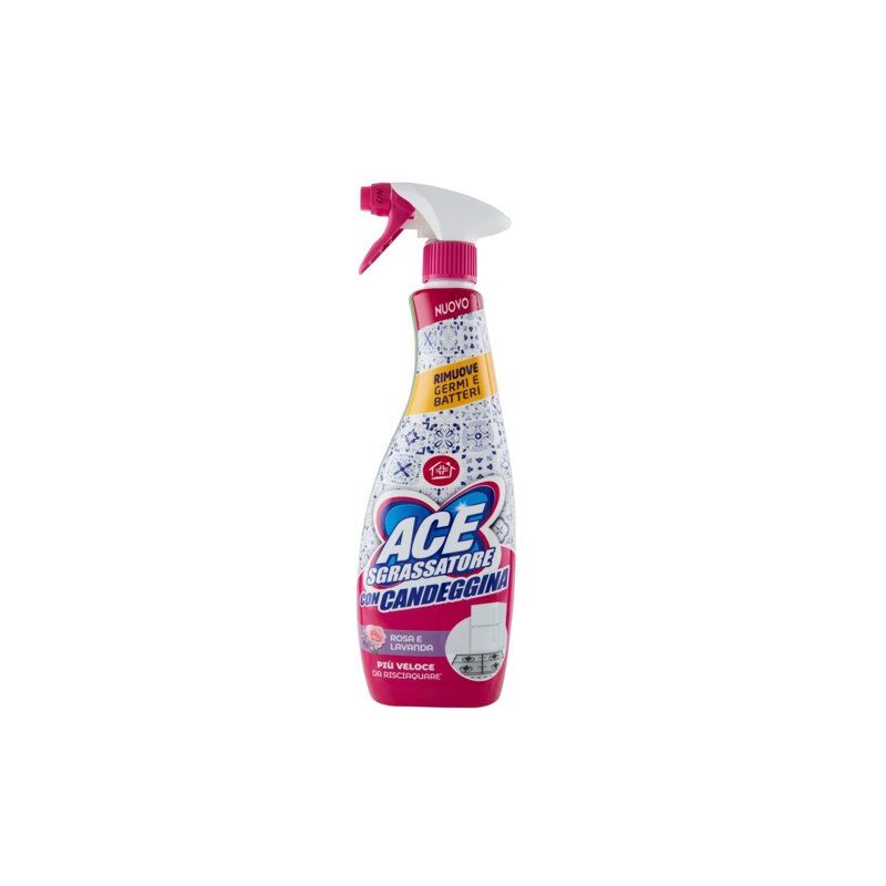 ACE Sgrassatore con Candeggina Rosa e Lavanda 600 ml Scopri l'efficacia del nuovo ACE Sgrassatore con Candeggina Rosa e Lavanda da 600 ml. il prodotto ideale per una pulizia profonda e profumata. Questo sgrassatore è perfetto per eliminare lo sporco più ostinato e igienizzare le superfici della tua casa. Grazie alla sua formula avanzata. garantisce risultati impeccabili con un fresco profumo di rosa e lavanda. Non perdere l'occasione di rendere la tua casa splendente e profumata con ACE Sgrassatore. Formula Potente: Rimuove efficacemente grasso e sporco ostinato da tutte le superfici. Igienizzazione Profonda: La candeggina garantisce una pulizia igienizzante. eliminando germi e batteri. Profumo Fresco: Lascia un piacevole aroma di rosa e lavanda che dura a lungo. Versatilità: Adatto per cucina. bagno e altre superfici domestiche. Formato Pratico: Bottiglia da 600 ml. facile da usare e conservare. ACE Sgrassatore con Candeggina Rosa e Lavanda è la scelta perfetta per chi desidera una