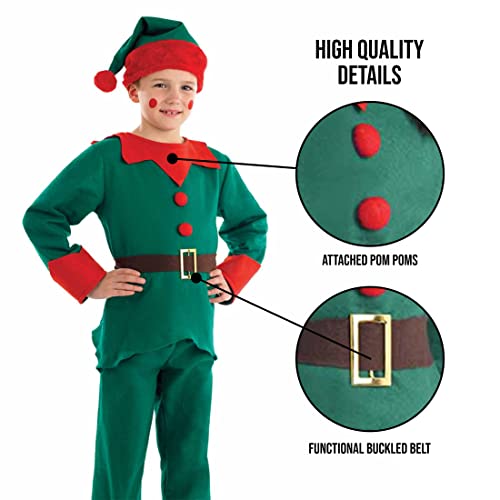 Perfetto costume da elfo per bambino, ideale per pigiama o vestito in famiglia per natale, cosplay per bambina o bimbo e abbigliamento cosplay folletto babbo natale per giochi di ruolo.