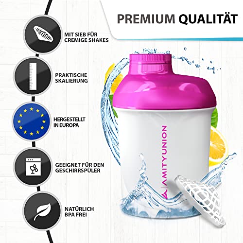Shaker per proteine da donna 400 ml Deluxe a prova di perdite, Europa, 100% senza BPA con setaccio e scala per frullati di siero di latte cremosi, shaker proteico originale in rosa e bianco