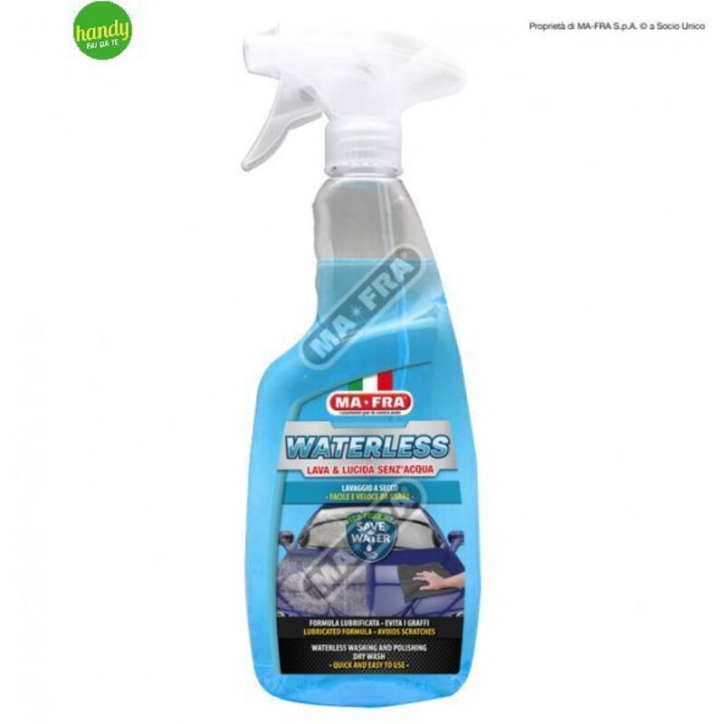 Lava e lucida senz'acqua Lavaggio a secco Formula lubrificata Non lascia graffi o aloni Descrizione WATERLESS - Lava e Lucida senza l'utilizzo di acqua, l'innovativo prodotto grazie al quale, in modo semplice e veloce, l'auto sarà pulita, lucida e protetta, ovunque e in completa sicurezza, senza utilizzare una sola goccia d'acqua! WATERLESS, l'innovativo pulitore senz'acqua è in grado di pulire perfettamente tutte le parti esterne della vettura, lasciando l'auto lucida e protetta a lungo. Applicato sulla carrozzeria, consente di distaccare facilmente e rapidamente lo sporco, permettendone la rimozione in totale sicurezza, grazie alla formula lubrificata anti-graffio. Il suo utilizzo è semplice e consente il lavaggio della vettura ovunque, senz'acqua. La sua innovativa formula permette di pulire qualsiasi superficie del veicolo donando allo stesso tempo lucentezza e protezione, sempre in grande sicurezza, senza creare graffi e riducendo al minimo l'impatto ambientale.