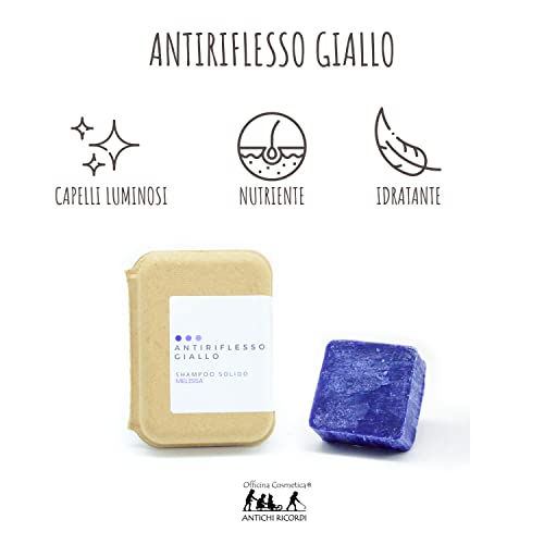Lo Shampoo Solido Anti Riflesso Giallo è formulato appositamente per i capelli biondi, decolorati o naturali, arricchito di riflessante viola aiuta a mantenere la chioma bionda senza riflessi gialli e/o oro. Preserva la tonalità del colore lasciando i capelli luminosi e rivitalizzati, contiene Burro di Karitè dall'azione nutriente e idratante. Con profumazione alla Melissa priva di allergeni.