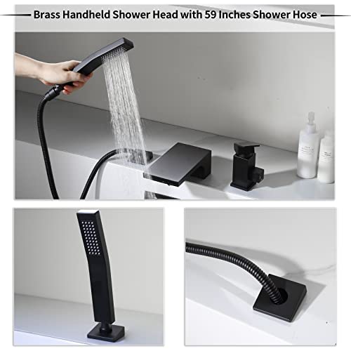 SHANFO Rubinetto per Vasca 3 Fori, Rubinetto per Bordo Vasca Cascata, Miscelatore Vasca da Bagno con Doccetta, Nero, 6Y3OK