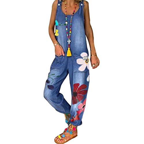 CURT SHARIAH Womens Dungarees Denim Jean Flower Printed Jeans Overalls Jumsuit with Pockets (Blue,S)