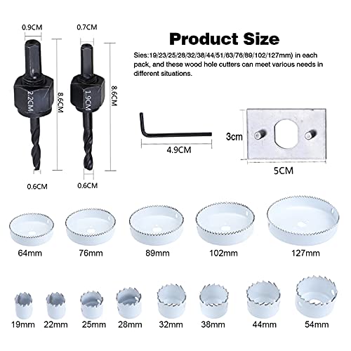 【13 Misure】19/22/25/28/32/38/44/54/64/76/89/102/127 mm, Copre le dimensioni di seghe a tazza più comuni sul mercato e queste frese per legno possono soddisfare varie bisogni in diverse situazioni.