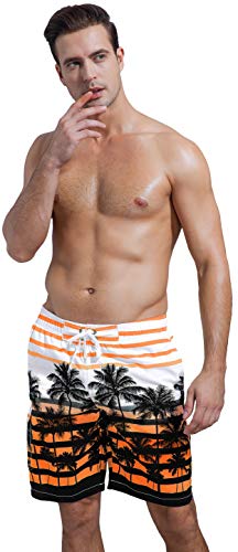SHEKINI Pantaloncini da Spiaggia Uomo Costume da Bagno Uomo Nuoto Tronchi Spiaggia Surfing Shorts Coulisse Regolabile con Tasche Albero di Cocco Printing Casuali Calzoncini da Bagno (36, Arancio)