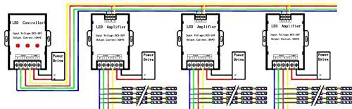 Ogni amplificatore RGB aggiuntivo può raddoppiare il numero di LED e collegare teoricamente innumerevoli amplificatori RGB.