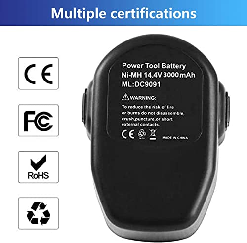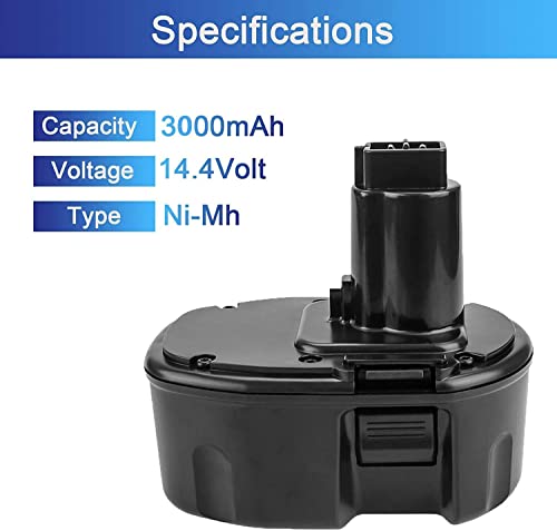 Specifiche della batteria: Tipo: Ni-MH. Capacità: 3,0 Ah. Voltaggio: 14,4 V. Colore: nero. Sostituisce perfettamente la batteria Dewalt 14,4 V DC9091.