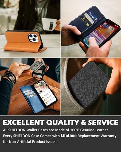 SHIELDON Cover per iPhone 15 Pro 5G, Custodia iPhone 15 Pro Vera Pelle Portafoglio Slot Schede Blocco RFID Resistente Cavalletto Flip Caso Magnetico Compatibile con iPhone 15 Pro (6,1" 2023), Blu Navy