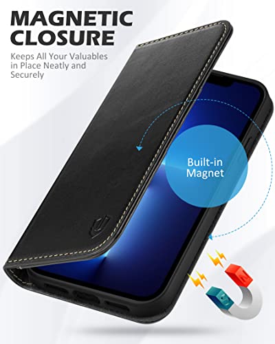 SHIELDON Custodia per iPhone 13, Cover Vera Pelle Antiurto Portafoglio Slot Schede [Blocco RFID] Flip Caso Magnetico Cover Cavalletto Protezione Compatibile iPhone 13 (6,1 Pollici 2021), Nero retrò