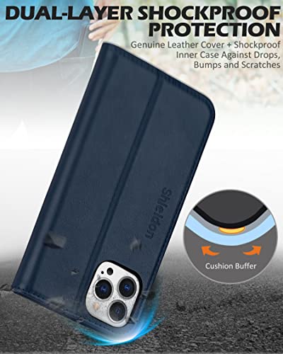 SHIELDON Custodia per iPhone 12 Pro Max, Cover Vera Pelle Blocco RFID Portafoglio Slot Schede Resistente Cover Cavalletto Flip Caso Magnetico Compatibile iPhone 12 Pro Max (6,7" 2020), Blu Navy