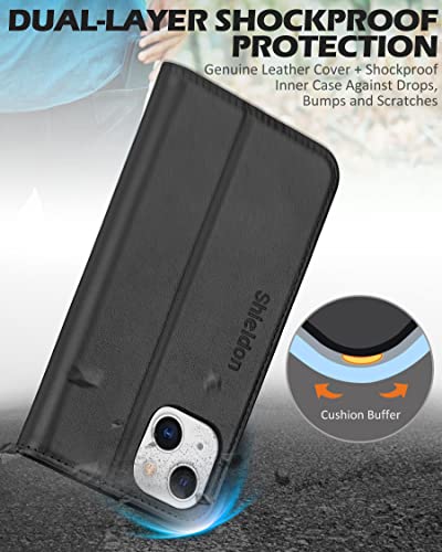 SHIELDON Custodia per iPhone 13, Cover Vera Pelle Portafoglio [Blocco RFID] Slot Schede TPU Resistente Cover Cavalletto Protezione Flip Caso Magnetico Compatibile iPhone 13 (6,1 Pollici 2021), Nero