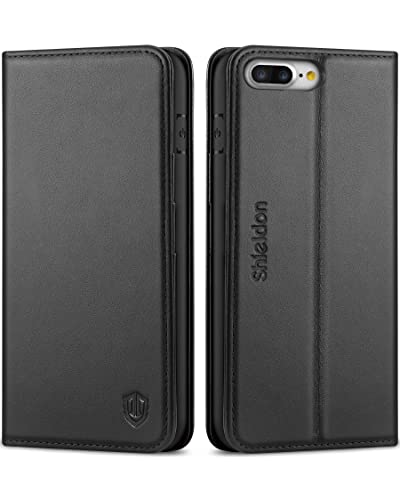 SHIELDON Custodia per iPhone 8 Plus, Cover per iPhone 7 Plus, Vera Pelle Portafoglio Protezione Slot Schede Chiusura Magnetica Cover Cavalletto TPU Resistente Compatibile con iPhone 7 Plus, Nero