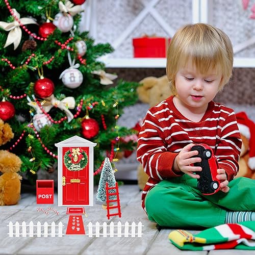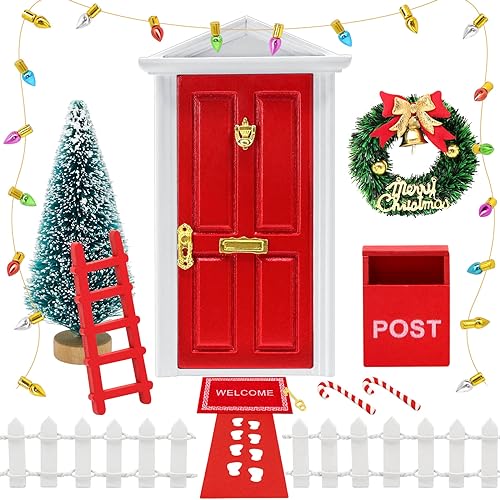 14 pezzi per porta elfo natale kit: Riceverete 1 x porta delle fate rossa,1 x chiave,1 x albero di Natale,1 x tappetino per la porta a forma di zampa,1 x tappetino per la porta di benvenuto,2 x recinto,1 x striscia luminosa colorata,2 x bastoncini di zucchero,1 x cassetta postale,1 x ghirlande decorative, 1 x scala di legno,1 x nastro adesivo,per un totale di 14 prodotti.Accogliendo Babbo Natale e elfo nella tua casa da favola