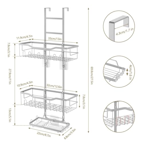 【Robusto e durevole】 Dimensioni: 13"x4,7" x27,5" (33x12x70 cm). Puoi appenderlo a qualsiasi porta che non superi 1,7 pollici (4,3 cm) di spessore nel bagno, nella stanza o in cucina. Con un capacità di carico fino a 40 libbre, può soddisfare perfettamente le tue esigenze di stoccaggio.La mensola per doccia ha una superficie liscia, facile da pulire, non arrugginisce ed è durevole.
