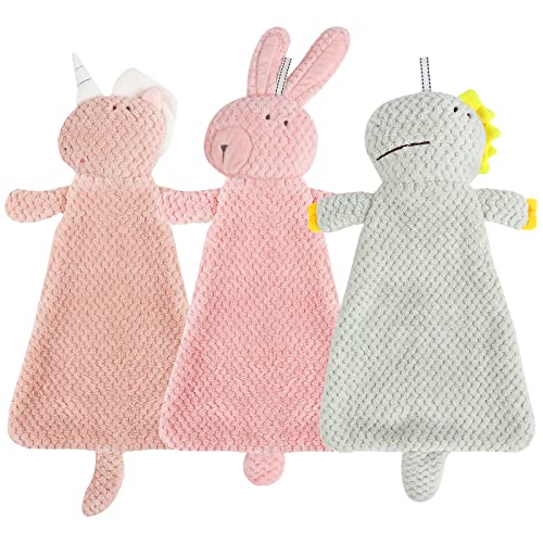 Shinowa Set di 3 Asciugamani da Bagno Simpatici per Bambini, Mini-Asciugamani da Appendere per Asciugare Le Mani in Velluto Corallo Morbido Animali Cartoni Animati Carini, Marrone Chiaro&Rosa&Verde