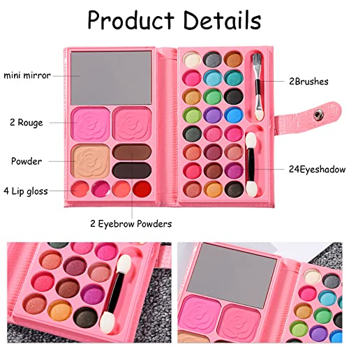 Set trucco per bambini ragazze: Contiene 4 × rossetto, 21 × ombretti, 3 × fard, 2 × polvere per sopracciglia, 2 × pennelli, 1 × specchio cosmetico. Con questo vassoio per il trucco, le bambine possono truccarsi e giocare da sole.