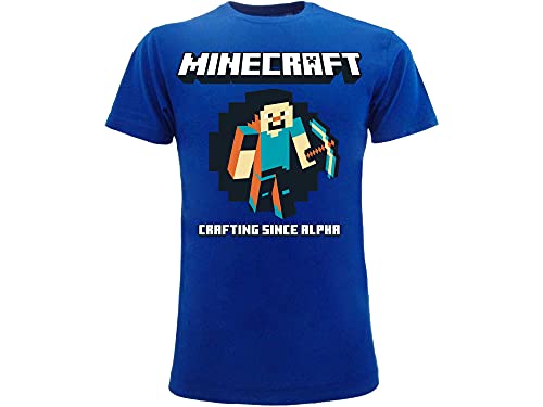 T Shirt Minecraft Ufficiale Steve Crafting Since Alpha. Taglie per Bambini e Ragazzi. Blu. 100% Cotone. Maniche Corte. Prodotto su Licenza. (9-11 Anni)