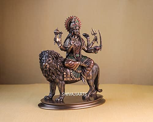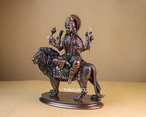 SHIVAJI ARTS Durga Statua in bronzo legato seduto su leone colore marrone, 10 pollici, confezione da 1