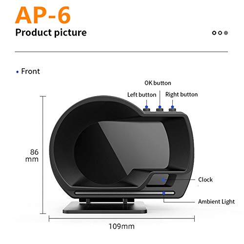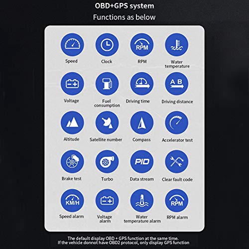 Display modalità OBDⅡ: velocità del veicolo, velocità di rotazione, temperatura dell'acqua, tensione, distanza di guida, tempo di guida, consumo di carburante, ora locale, temperatura dell'olio, pressione della turbina, test di accelerazione di 100 km.