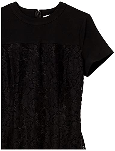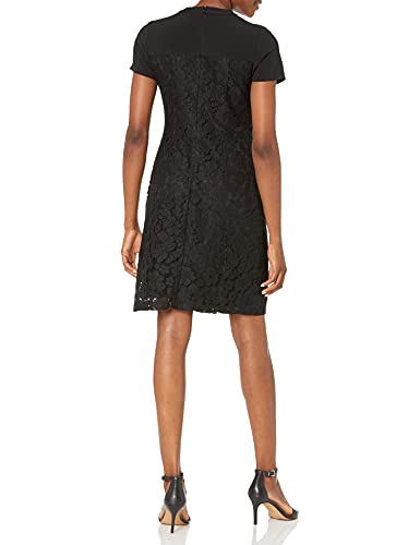 Questo abito a mezza coscia presenta maniche corte, girocollo e dettagli in pizzo.