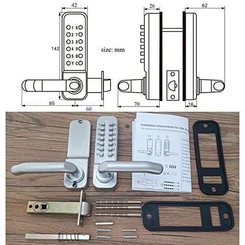 - Facile da installare, dopo i fori realizzati sulla porta secondo il modello allegato.NOTA: assicurarsi che tutte le parti funzionino correttamente prima dell'installazione. Non stringere eccessivamente i bulloni di fissaggio, poiché ciò potrebbe causare distorsioni e carico a un funzionamento scadente.Non chiudere la porta prima che il codice e il lavoro di blocco siano confermati correttamente