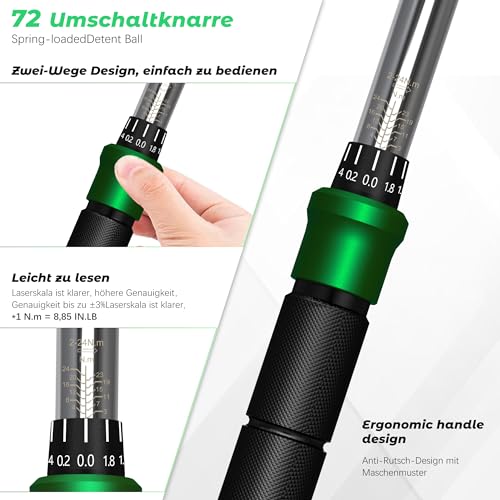 Materiali di alta qualità - Cricchetto realizzato in lega 40CRV ad alta durezza (acciaio al cromo vanadio), antiscivolo, antiruggine, resistente alla corrosione e di alta qualità, la scala laser è più chiara, maggiore precisione, facile da leggere.I raccordi sono realizzati in acciaio per utensili S2 con buona resistenza agli urti, durezza e tenacità.