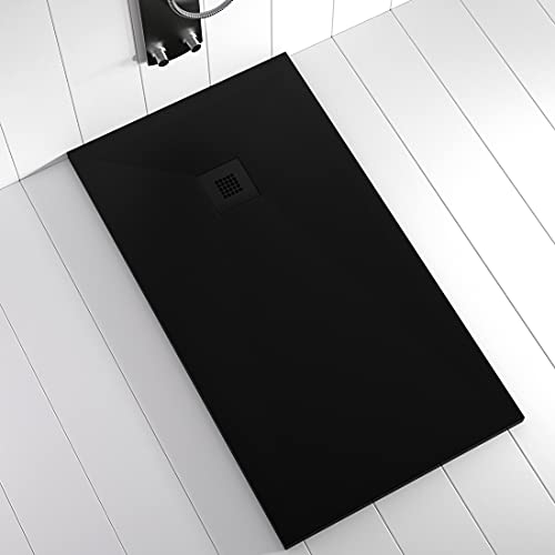 Shower Online Plato de ducha Resina PLES - 80x80 - Textura Pizarra - Antideslizante - Todas las medidas disponibles - Incluye Rejilla Color y Sifón - Negro RAL 9005