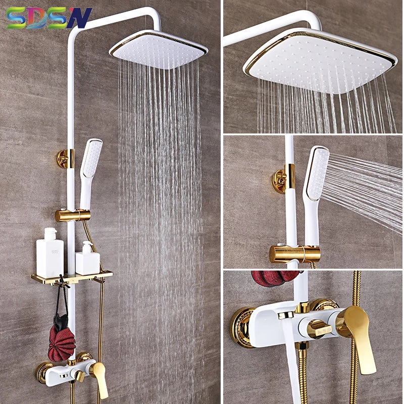 Shower Set SDSN White Gold Bathroom Shower System Quality Copper Brass Bathtub Faucet Rainfall Shower Head Spa Bath Shower Sets