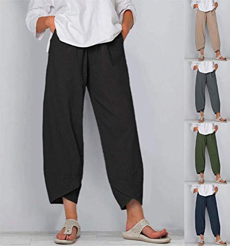 Shownicer Donna Pantaloni Cotone Estivi Pantaloni Lino Pantaloni Spiaggia Casual Morbidi Confortevoli Pantaloni Larghi Colore Solido con Coulisse 7/8 Lunghezza D Nero M
