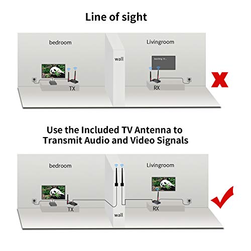 [Plug and Play, Line of Sight] non richiede l'installazione complicata di cavi o cavi, quindi la configurazione di questo HDMI Extender di rete è semplice e veloce. Le doppie antenne consentono una trasmissione forte del segnale e una trasmissione a lunga distanza. Se un ostacolo / muro oscura la linea di vista tra il trasmettitore e il ricevitore, la trasmissione effettiva può essere notevolmente ridotta. In questo caso, si consiglia di utilizzare un'antenna TV per trasmettere segnali.
