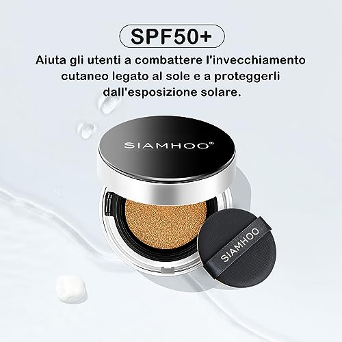 (PROTEZIONE SOLARE SPF50): SIAMHOO crema solare in a lunga durata del cuscino d'aria, il nostro fondotinta adotta la formula SPF50, che aiuta gli utenti a combattere contro l'invecchiamento della pelle correlato al sole, correttore uniforme, colore della pelle irregolare liscio e allo stesso tempo, ti diamo anche una texture perfetta e semi opaca.
