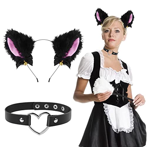 Sibba Cerchietto per Capelli Con Orecchie Gatto Fox Cosplay 2 Pezzi Punk Girocollo Collare Campane Fiocco Carino Coniglietto Pasqua Halloween Maschera Festa Styling Costume Donne Ragazze (Nero Cuore)