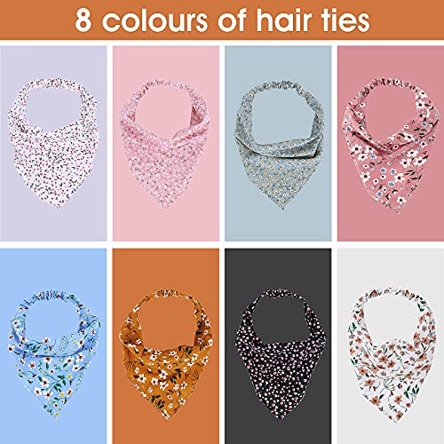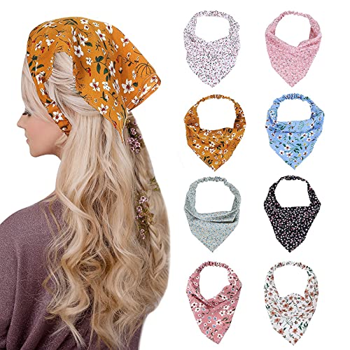 Modelli retrò e classici: la confezione include 8 sciarpe floreali elastiche in 8 diversi stili, i vari stili e i colori degli accessori per capelli boho sono facili da abbinare al tuo abito quotidiano, la quantità sufficiente di sciarpe triangolari è sufficiente per l'applicazione e la sostituzione