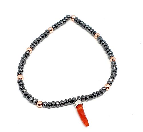 Sicilia Bedda - Bracciale Elastico con Pietra Ematite e Ciondolo in Corallo Rosso del Mediterraneo - Argento 925 - Prodotto realizzato interamente a Mano (Pietre Grigie e Rosè (8x1))