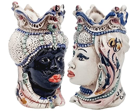 Sicilia bedda - Coppia Teste di Moro Siciliane in Ceramica di Caltagirone - Realizzato Interamente a Mano - H 13 Centimetri (Fantasia Siciliana)