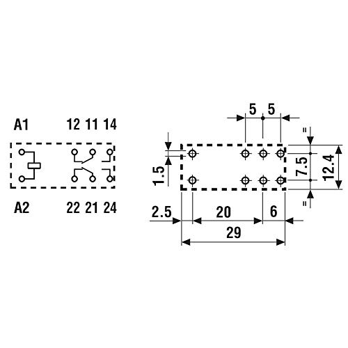 Relè per circuiti stampati con contatti guidati secondo EN 50205: 2002 tipo B con 2 contatti di commutazione (secondo EN50205:2002 è permesso utilizzare come contatti guidati esclusivamente un apritoio e un dispositivo di chiusura 11-12 e 21-24 o 21-22 e 11-14!)