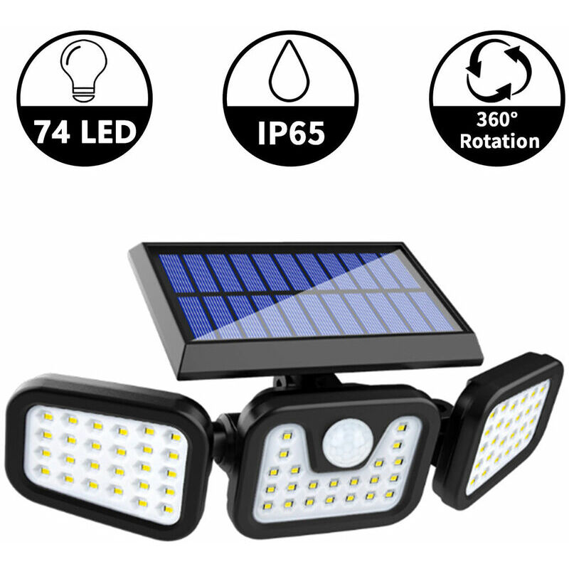 Descrizione del prodotto Pannello solare: 1,8 W, 5,5 V Potenza: 15 W, Lumen: 300lm Batteria agli ioni di litio: 3,7 V, 2400 mAh< br/>Grado di impermeabilità: IP65 1. [Faretti ruotabili a 360° luminosi a 74 LED] Le luci di sicurezza solari a 3 teste hanno un design ruotabile multi-giunto, pannello solare e faretti regolabili in modo indipendente a 360°, possono essere ruotati in qualsiasi angolazione per le vostre esigenze, che forniscono una gamma più ampia e flessibile di luce. 2. [Energia solare ecologica da 2400 mAH]: la luce del sensore di movimento solare ha una funzione di sensore di movimento del corpo integrata e un sensore di scarsa luminosità. Può rilevare distanze fino a 33 piedi, con un raggio di 120°. Quando viene rilevato, si accende per 30 secondi e poi si spegne automaticamente. 3. [IP65 Resistente alle intemperie Facile da installare] Luci di sicurezza solare Grado di impermeabilità: IP65, può essere montato a parete con viti, adatto a tutte le condizioni atmosferiche