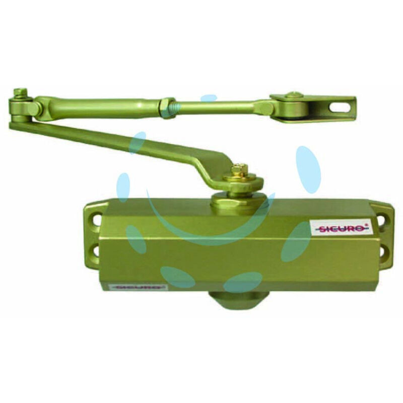 Corpo monoblocco in lega di alluminio, braccio in acciaio, 2 valvole di regolazione della velocit? di chiusura, forza di chiusura regolabile n?1-2-3, per porte con peso da kg.25?60 max (intercambiabile con il modello art.7141603+d14160390)